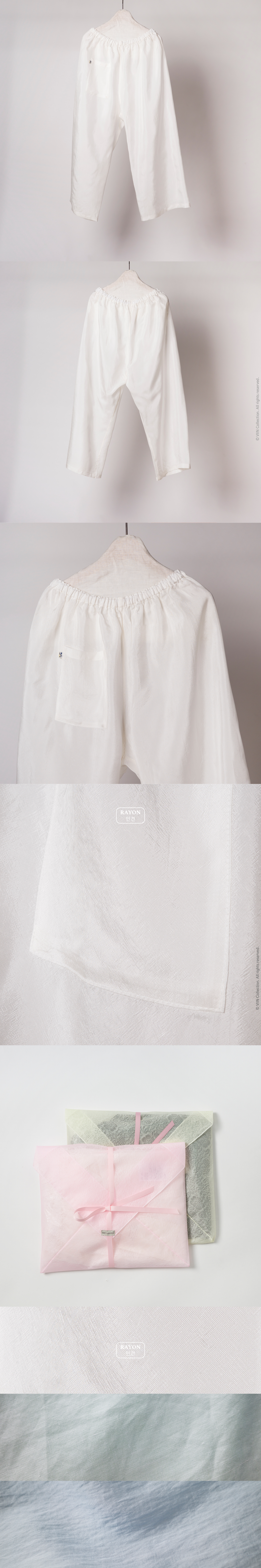 한복 고쟁이의 모습을 본떠 주머니를 앞에 달아 만든 인견 바지입니다. 대표 여름 소재인 인견은 얇고 흡습성이 좋으며, 피부에 잘 달라붙지 않아 잠을 잘 때나 속바지로 입기에 좋습니다.